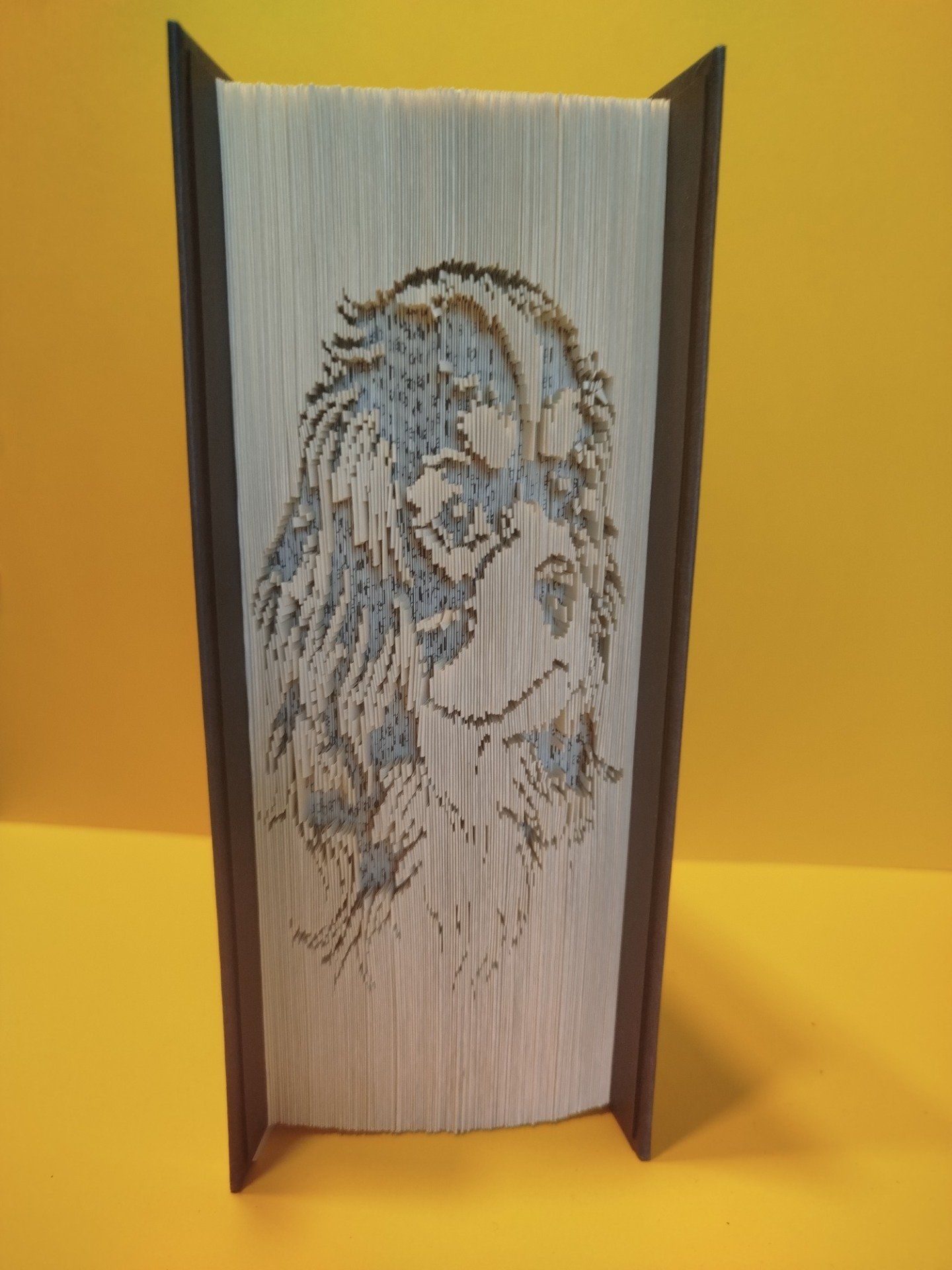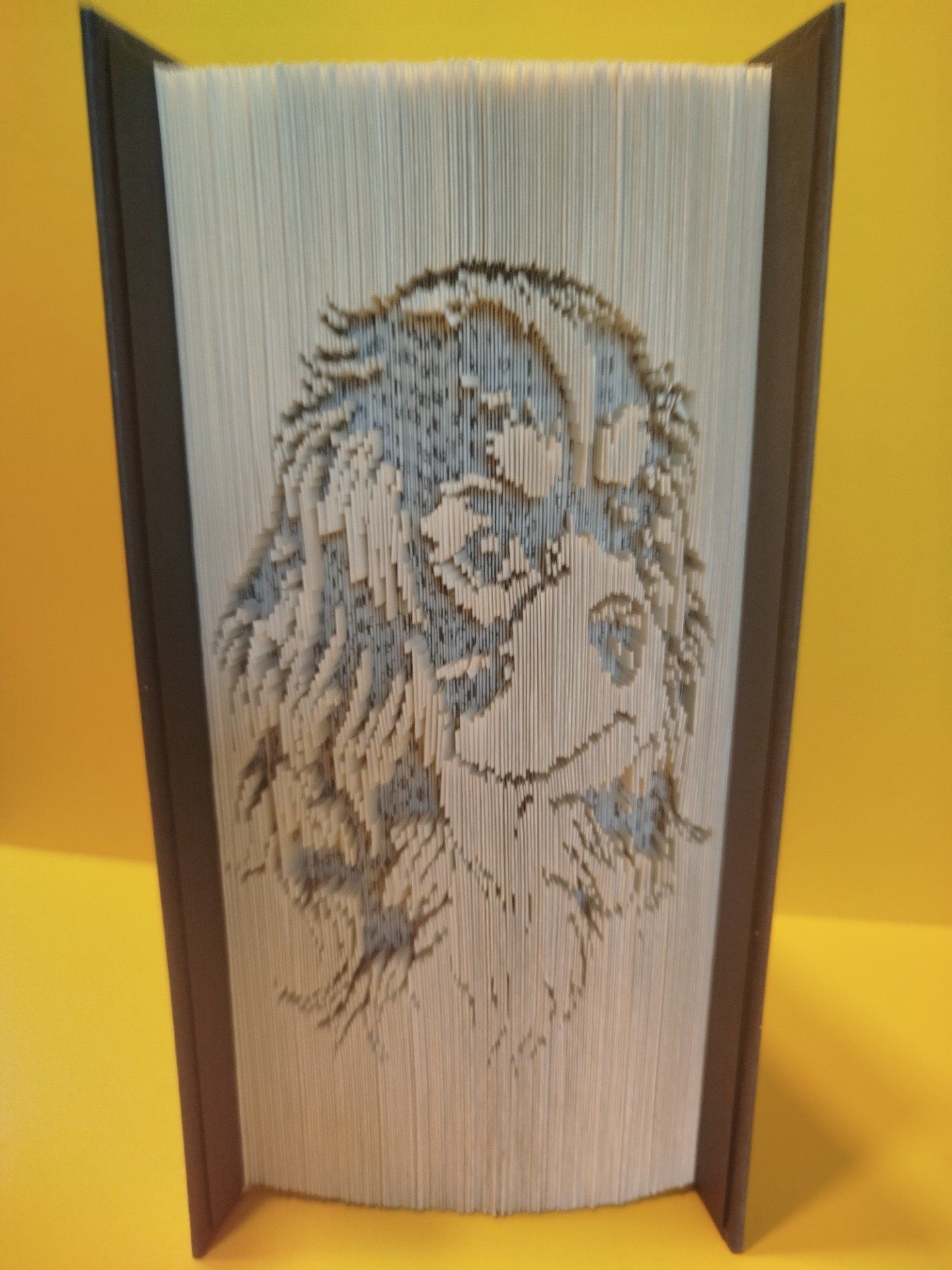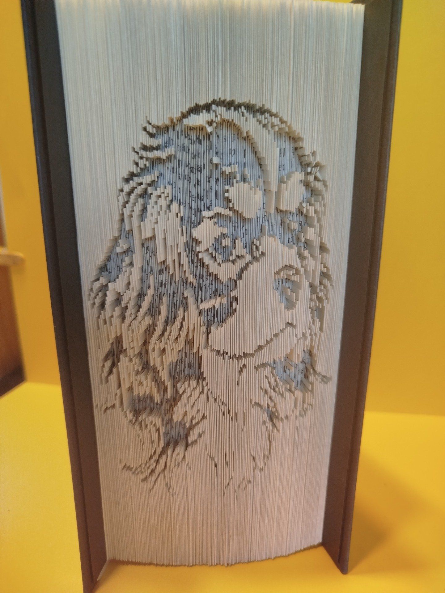 Offrez une seconde vie à un livre avec cette création unique représentant la silhouette élégante du Cavalier King Charles. Chaque pli est soigneusement réalisé à la main pour dessiner ce compagnon fidèle